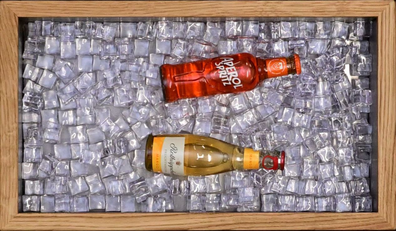 Eiswürfelbox aus Edelstahl mit massivem geölten Eichenrand. An der Unterseite mit Ablassschraube. Größe 52*30*12 cm L*B*T