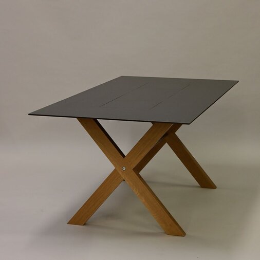 Tisch "Piazza" mit einem Satz Einlageplatten in Tischfarbe. Ausführung Gestell in Eiche massiv geölt mit Edelstahlstrebe. Tischplatte aus witterungsfester Kompaktplatte in zwei Farben. Der Tisch ist zerlegbar.