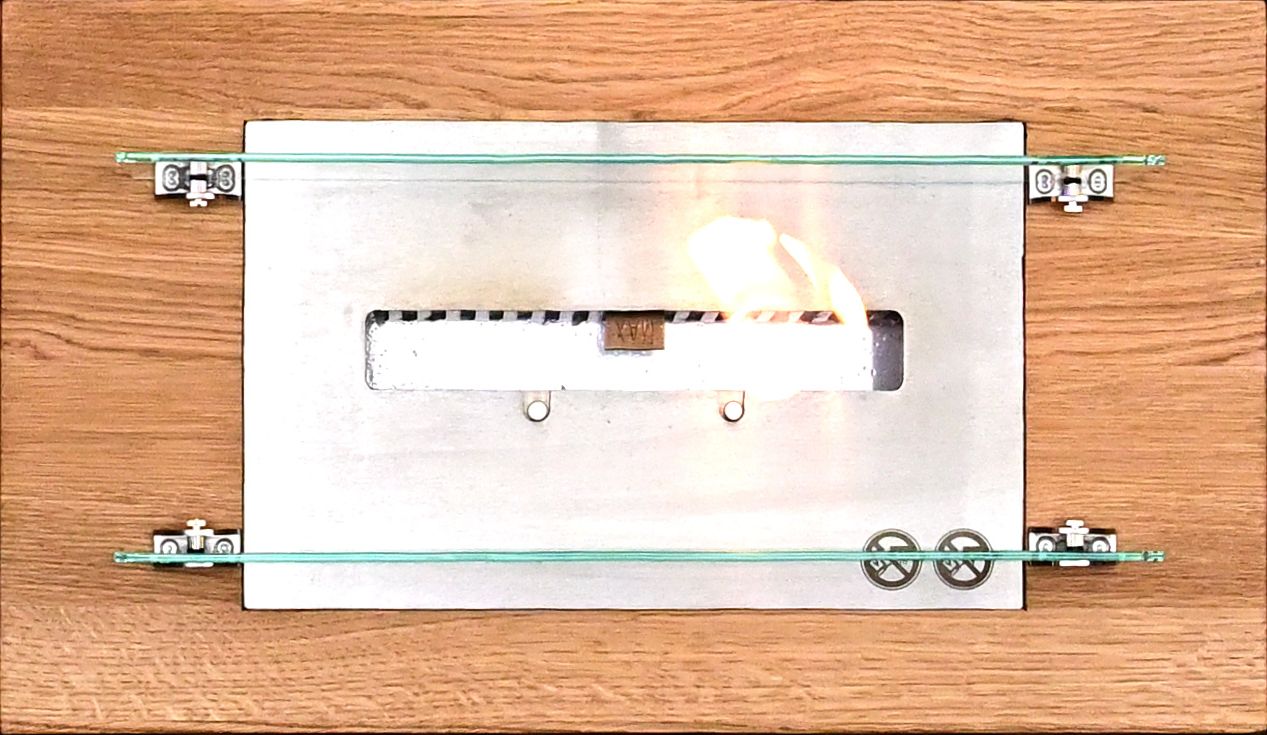 Einlage Tischfeuer für Ethanol mit zwei Schutgläsern aus Sicherheitsglas. Ausführung Grundplatte Eiche massiv geölt, Feuereinsatz Edelstahl. Gesamtgröße 52*30 cm